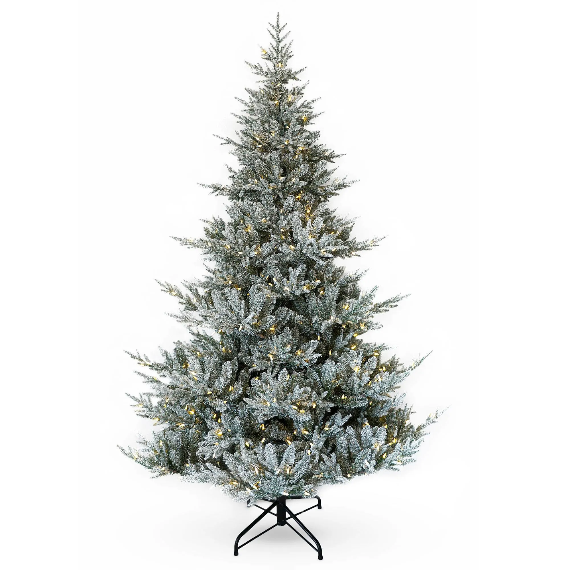 Create a wintry frosted theme with this snowy tree; add cool silver and frosted blue baubles then decorate with white ribbons or bows. This 7ft Snowy St Francis Spruce has a mix of moulded PE and PVC branches with a snowy look woven throughout with 450 warm white LED lights. It offers plenty of places to hang your baubles to make a sparkling Christmas display.